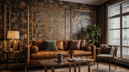 Bedroom decor, home interior design . Art Nouveau Bohemian style with Wallpaper decorated with Brass and Velvet material . Generative AI AIG26.