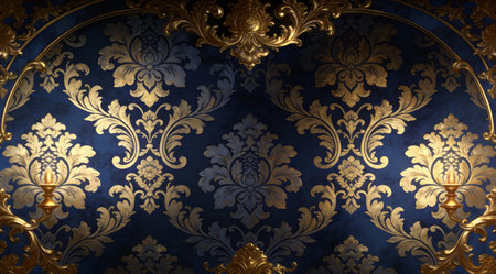 Elegant baroque-inspired digital artwork featuring intricate damask motifs in rich navy and gold palette, capturing a luxurious vintage mood with sophisticated lighting effects. Ideal for upscale interior decor, luxury fashion textiles, premium packaging, and elegant branding projects targeting high-end clientele. The opulent floral designs and detailed artis... AI-generated digital illustration. AI-generated illustration.