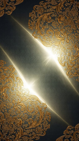 gold filigree flourishes adorn a textured teal background, bisected by bright diagonal light streaks, creating a and dramatic effect.