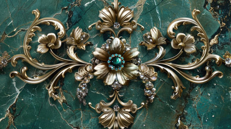 A masterfully crafted gold and turquoise floral arrangement, elegantly embossed on a dark marble surface.