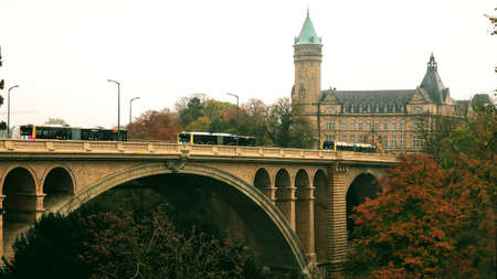 Luxembourg city, Luxembourg - Sep 1 2025 Adolphe Bridge provides a one-way route for road traffic across the Petrusse, from Boulevard Royal, in Ville Haute, to Avenue de la Liberte in Gare.