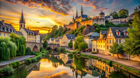 Luxembourg Cityscape: Historic Castle and Church by River