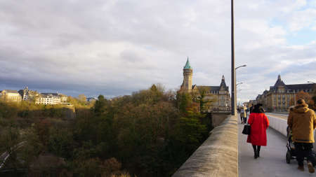 Luxembourg - January 01, 2022: People going at Luxembourg old town, UNESCO World Heritage Site, with the ancient city wall at Luxembourg on January 01, 2022