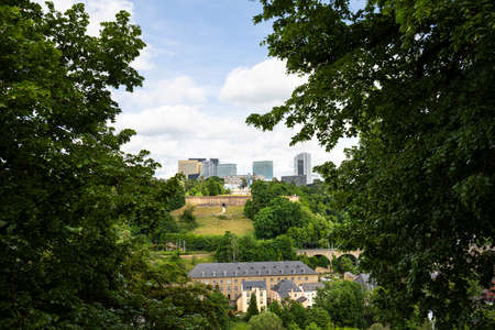 Luxembourg City, Luxembourg - May 19, 2019: Panoramic view of Luxembourg City over the greenery. One third of the surface of the city is shaped by beautifully landscaped green spaces.