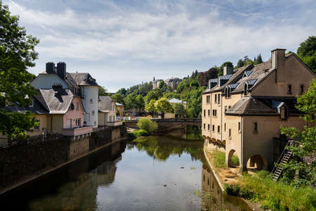 Luxembourg City,Luxembourg - May 19, 2019: Houses on the bank of river Alzette in Luxembourg, the capital of the small European nation of the same name famed for its ruins of medieval fortifications.