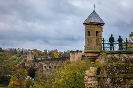 Luxembourg - October 21, 2017: Three Towers, historic monument dating from the 13th centiry and unidentified people on the ancient wall