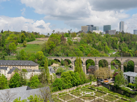 Luxembourg City,Luxembourg - May 19, 2019: Bridge over river Alzette in Luxembourg, the capital of the small European nation of the same name famed for its ruins of medieval fortifications.