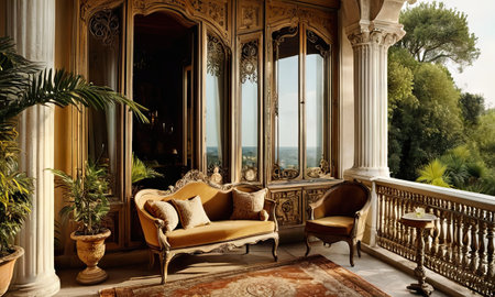 very rich interior of the apartment with golden decorations on the walls in the Baroque style and luxury furniture with gold paint.