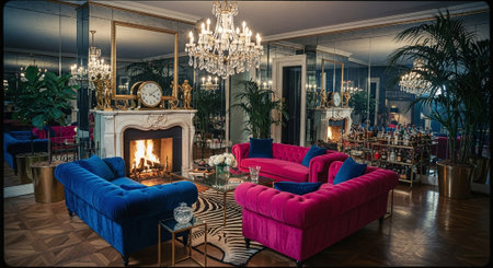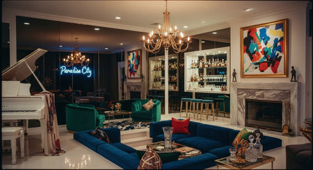 A modern living room with colorful sofas, elegant decor, and a stylish bar area, featuring artwork on the walls and a large chandelier overhead