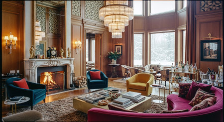 Luxurious living room with elegant chandelier and cozy fireplace in classic interior design. That the image is generated using AI.
