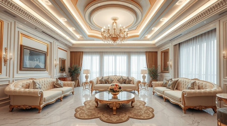 Luxury interior of a classic royal house. Sofa, armchairs, table and other furniture.