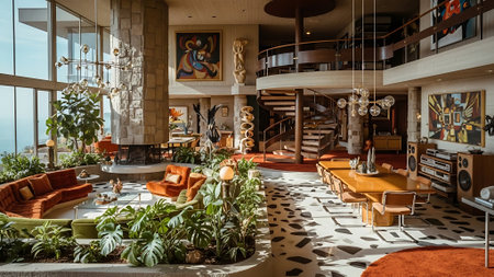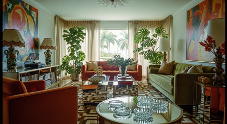 A stylish retro living room with large windows, featuring colorful furniture, a round coffee table, and vibrant floral arrangements