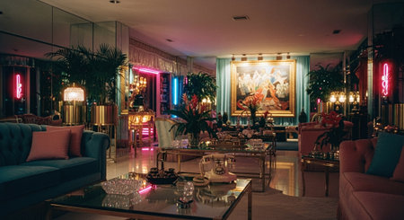 Interior of a night club with neon lights and colorful furniture.
