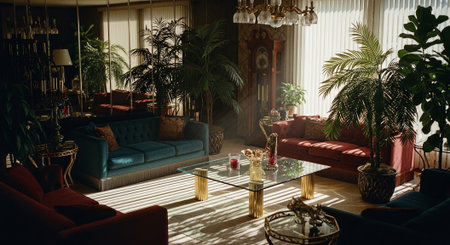 Interior of modern living room with furniture and plants, vintage style