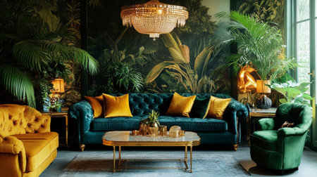 A luxurious indoor space featuring three stylish sofas in green, orange, and yellow, surrounded by lush plants and elegant decor, with chandeliers and a bright atrium