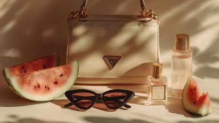 Elegant shopping flatlay, cream background, watermelon slices, luxury handbag, cat-eye sunglasses, minimalist perfume bottle, soft sunlight and subtle shadows