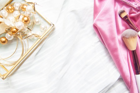 frame for text made of pink professional makeup brushes perfume beads and earrings in the box on white background. Beauty and fashion concept. top view flat lay. copyspace.