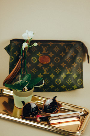Madrid, Spain, May 1, 2023 Vintage still life with bag of luxury brand Louis Vuitton, white orchid in pot on gold tray. Cosmetic table Glamour objects