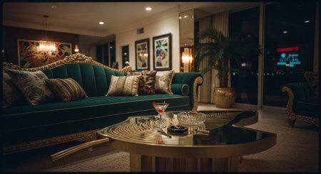 Living room decor, home interior design . Art Deco Glamorous style with Fireplace decorated with Marble and Velvet material . Generative AI AIG26.