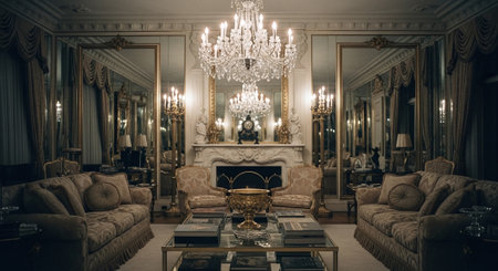 Luxurious living room with elegant chandelier and cozy fireplace in classic interior design. That the image is generated using AI.