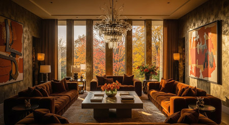 A stylish living room with large windows showcasing a mountain view, featuring modern furniture, warm autumn colors, and decorative plants