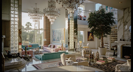 A spacious and stylish living room featuring modern furniture, large windows, and elegant chandeliers, with a mix of colorful decor and greenery