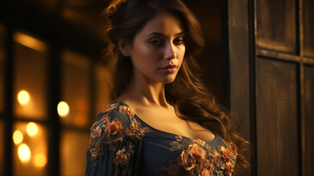A serene young woman dressed in a green outfit adorned with delicate flower embellishments, stands out in a softly lit setting, her gaze tender, exuding an air of quiet confidence and grace.