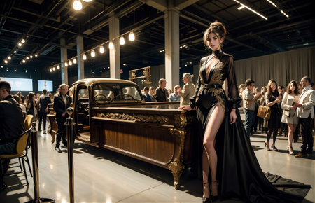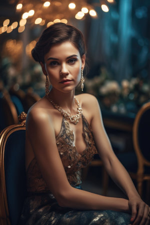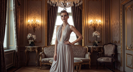 Elegant model in shimmering gown poses gracefully at luxurious event venue