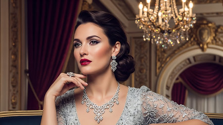 A glamorous woman in a stylish evening gown, with her makeup enhancing her natural beauty, as she poses in front of a luxurious backdrop, ready for a night out.