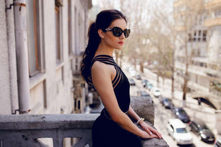 A beautiful, brunette in black sunglasses and dress, hair ponytail, smilling, posing on the balcony.
