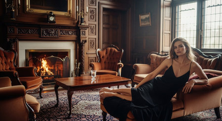Portrait of a beautiful woman in a long black dress sitting in a room with a fireplace