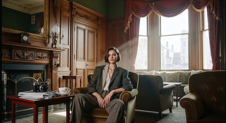A stylish woman in a beige blazer and satin top, posing confidently in front of a large softbox light, with a modern interior background