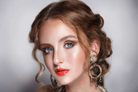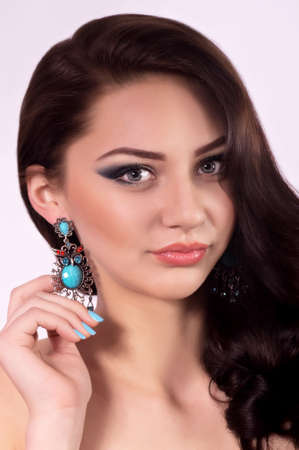 Portrait of beautiful young woman with makeup and with jewelry precious decorations