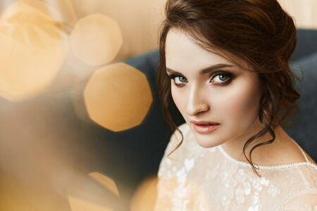 Beautiful brunette model woman, with blue eyes, with wedding hairstyle and with professional bright makeup. Seductive portrait of a young stylish bride