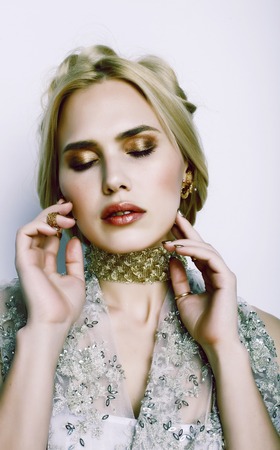young pretty woman with party make up elegant dress on white bac