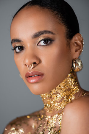 Portrait of pretty african american model with foil on chest and piercing isolated on grey
