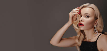 blond hair beauty woman portrait wears golden ear-rings and necklace in luxury sexy style fashion model on grey background