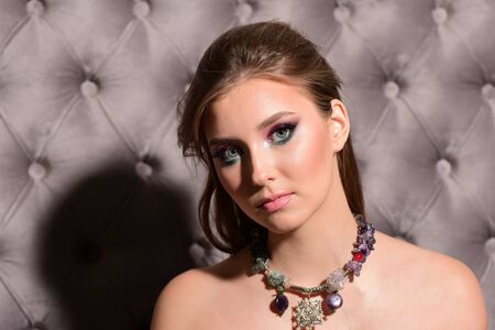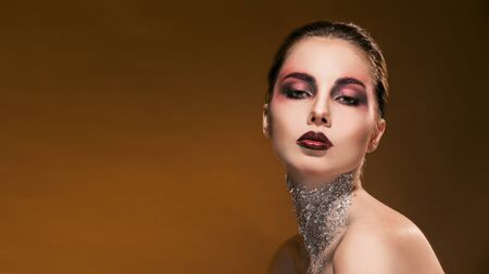 portrait of beautiful girl with beautiful makeup and silver on the neck. cosmetics
