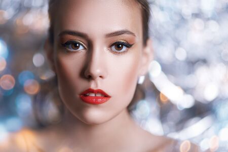 Make-up and cosmetics. Close-up portrait of a gorgeous young woman with golden make-up on a sparkling silver background. Party style.
