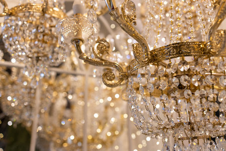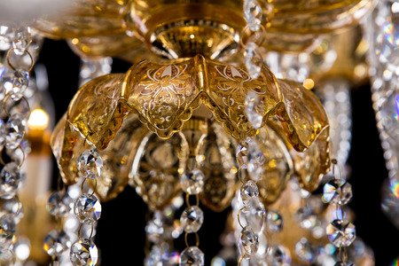 Beautiful crystal chandeliers warm light reflecting through brushed czech glass crystals hanging on vintage chandelier with bokeh background
