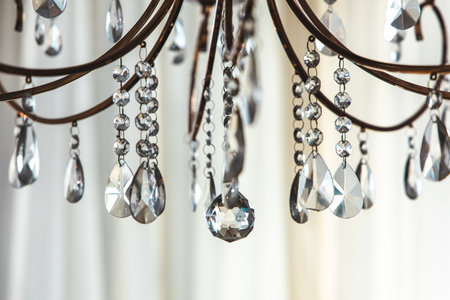 Close up on crystal of contemporary chandelier, is a branched ornamental light fixture designed to be mounted on ceilings or walls