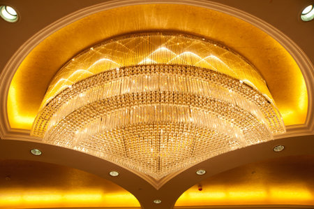 luxury chandelier close-up. Gold sparkling chandelier in an expensive luxury hotel. Interior luxury