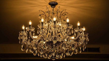 An Elegant Crystal Chandelier That Sparkles Radiantly in the Warm, Inviting Soft Light