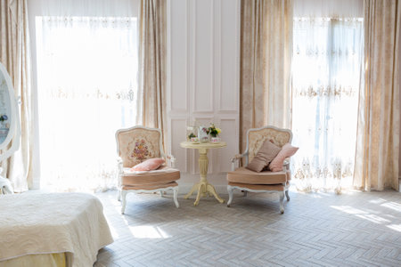 Luxurious expensive interior design of the bed room in the old Baroque style in beige colors