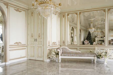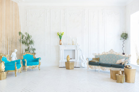luxurious light interior in the Baroque style. A spacious room with a road chic beautiful furniture, a fireplace and flowers. plant stucco on the walls and light wood parquet