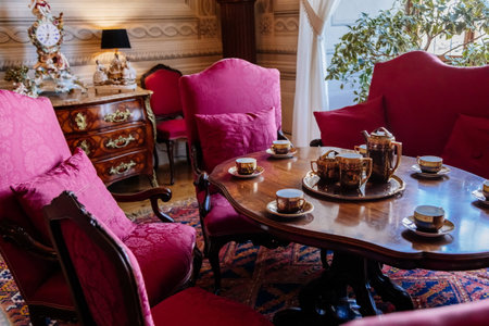 Litomysl, Czech Republic, 17 April 2022: Castle interior, living or dining room with baroque wooden carved furniture, antique sofa and soft armchairs near window, porcelain tea set on table