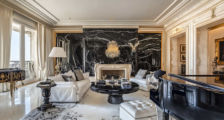 Luxury living room with marble and black walls. Nobody inside