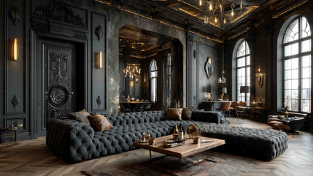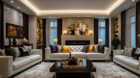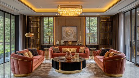 Luxury living room interior design with sofa and coffee table.