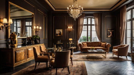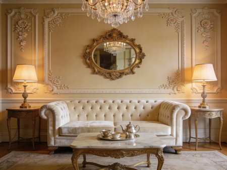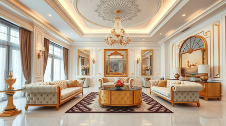 rich apartment interior with golden baroque decorations on the walls and luxury furniture. the room is flooded with the rays of the setting sun