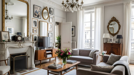 This image showcases an elegant living room adorned with classic decor. The room features a large fireplace with an ornate mantelpiece, surrounded by various framed artworks and mirrors. A comfortable sofa and armchair are arranged around a wooden coffee table, which holds a vase of fresh flowers. The space is illuminated by natural light streaming through tall windows draped with sheer curtains. A chandelier hangs from the ceiling, adding a touch of sophistication. The room exudes a warm and inviting atmosphere, perfect for relaxation and socializing.